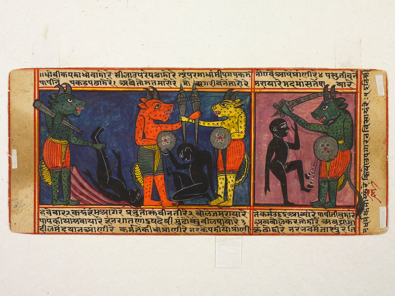 Il corpo e la morte. Nell’arte indiana non mancano le rappresentazioni dell'aldilà. Nell’immagine, tratta da un manoscritto del XVIII, la morte è ritratta in modo macabro e leggero, con demoni che chiacchierano indifferenti alle pene dei defunti. In India la morte è un passaggio e può anche portare alla liberazione dal flusso del continuo divenire –fine ultimo dell’hindu.