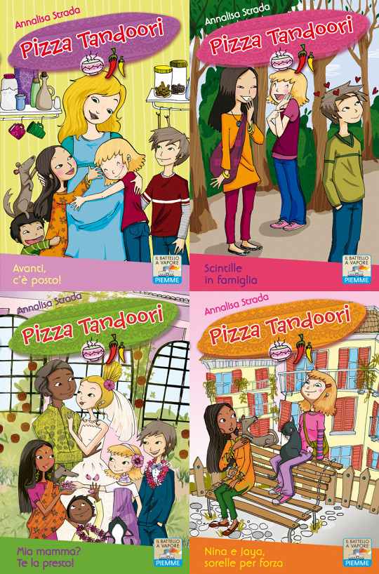 Mettetele insieme e avrete la nuova collana di libri per ragazzi edita da Piemme nella collana “Il battello a Vapore”. Le storie ideate e scritte da Annalisa Strada (bravissima autrice di libri per bambini dai 9 anni di età) ruotano sull’incontro, e sugli scontri, fra Jaya Maharajapuram e Nina Marotta, compagne di corso nella stessa scuola di danza che proprio non riescono a sopportarsi. Quando poi scoprono che i loro rispettivi genitori (indiano lui, italiana lei) si frequentano e si sono innamorati, fanno di tutto per evitare di diventare sorelle. Ma al cuore, si sa, non si comanda, e se entra in campo anche Irina, la tata ucraina di Jaya, a far scoprire alle ragazze e ai loro fratelli l’importanza di una famiglia unita, anche se unita dopo storie così differenti. E lo fa mettendo d’accordo tutti davanti alla sua specialità, la Pizza Tandoori, appunto, che unisce ingredienti cari ai tre paesi dei protagonisti della storia: le barbabiuetole della sua Ucraina, la mozzarella italiana e le spezie indiane. Perché c’è più gusto a incontrarsi che a restare da soli… Forse anche per questo al primo libro Nina e Jaya Sorelle per Forza nella collana Pizza Tandoori hanno fatto seguito Mia mamma? Te la presto!, Scintelle in famiglia e Avanti, c’è posto!