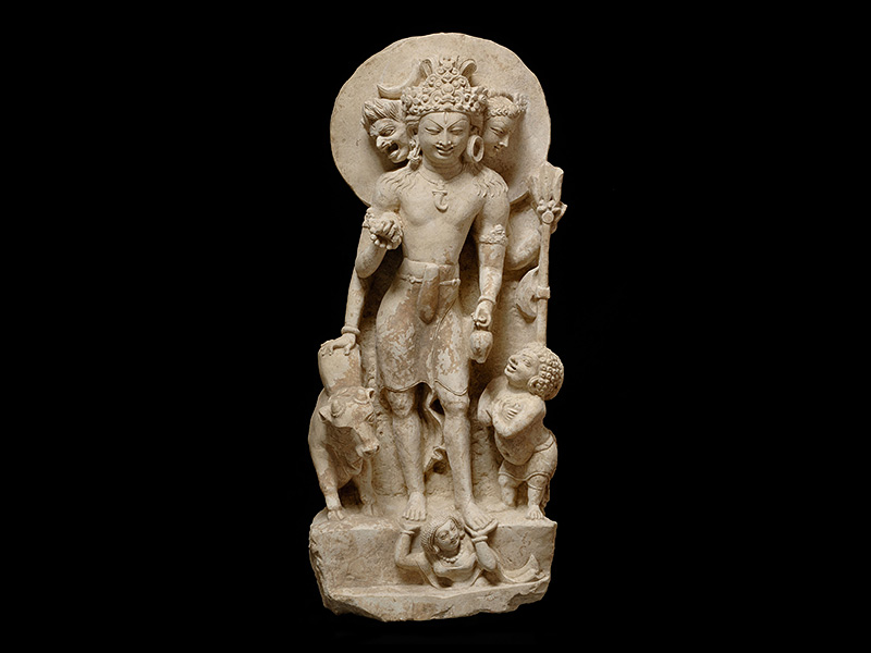 Il corpo degli dei. Shiva con tre teste è una rappresentazione della triade: creazione-sostentamento-distruzione, tre aspetti della manifestazione divina. Ai piedi di Shiva il fedele toro Nandin, Prithvi la terra e un nano deforme, parte della schiera di creature mostruose con cui il dio si accompagna (Punjab VII-VIII d.C)