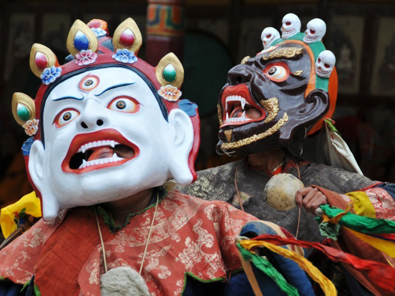 Tema comune a tutte le danze è la vittoria del bene sul male, simboleggiato dai demoni creati dall’ignoranza, rabbia, desiderio, gelosia della mente dominata dall’ego. I movimenti sono lenti e le espressioni grottesche, puntellate dai cimbali e dalle percussioni.