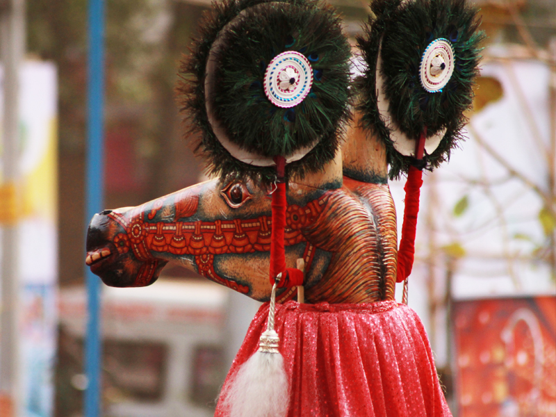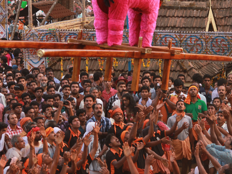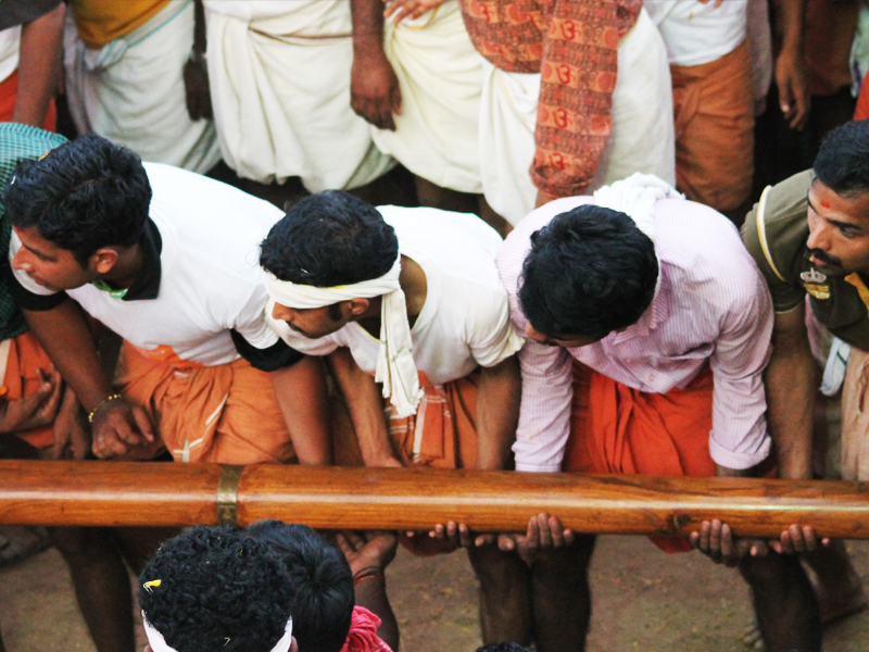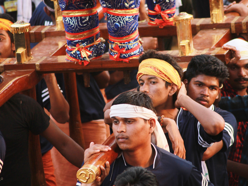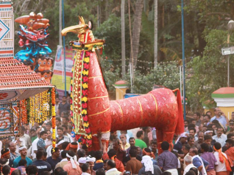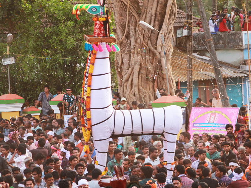 • Kuthira Kali: la danza dei cavalli. Cinque squadre principali, da cinque diverse zone, portano in processione a spalla alti cavalli fatti di bambù e decorati riccamente, sfidandosi a chi ha il cavallo più bello e quale danza meglio con tanto di salti verso il cielo (il tutto in pieno giorno, sotto il sole che anche a febbraio in Kerala scotta)