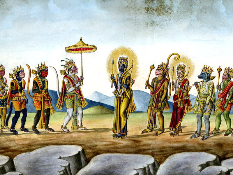 La storia dell’avatar del re Rama è raccontata dettagliatamente nel Ramayana, uno dei testi più conosciuti e raccontati dell’India. Nato ad Ayodhya il giovane Rama passa 12 anni in esilio nella foresta accompagnato dalla moglie Sita e da uno dei fratelli, Lakshmana. Poi il re dello Srilanka, il carismatico demone Ravana, si innamora di Sita e la rapisce, scatenando una serie di avventure che si concludono con una sanguinosa guerra finale. A perdere la testa, anzi le dieci teste, è naturalmente il demone prepotente con un debole fatale per le donne.